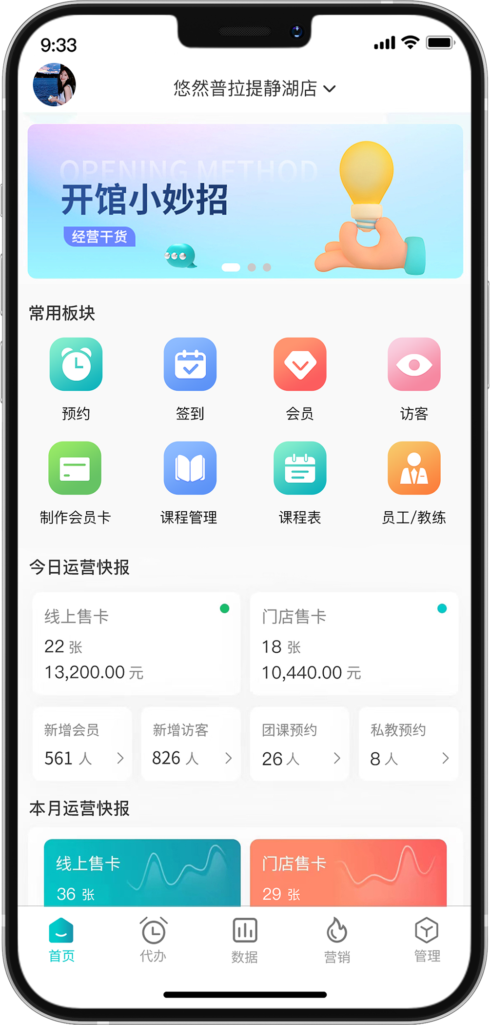 由专业IT团队,用心打造出高效、 能够实现约课,排课,运营数据分析,会员营销管理等功能, 整体提高会员店的管理效率。